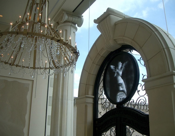 チャペル・ルアンジュ 京都・日本 2003年 チャペルの設計デザイン 祭壇、クリスタル製十字架、ガラス板プリント写真のステンドグラス、階段、 入り口、等。